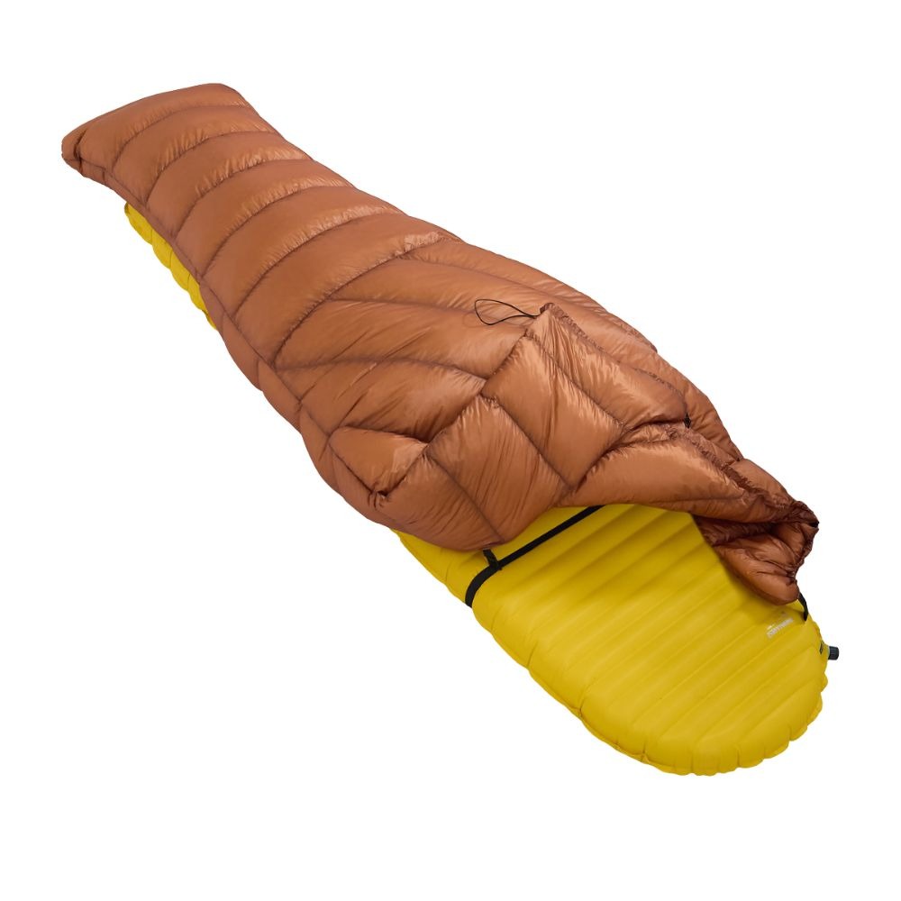 A closed, roomy footbox boosts comfort throughout the night. A super minimal stitched-through construction, ethically sourced Polish goose down with exceptional 900 Fill Power loft, and ultralight Toray® Airtastic 19 g/m² fabric make this a truly summer-focused piece that delivers high thermal comfort despite very low weight. A simple mattress attachment system compatible with pads 50 to 60 cm wide helps seal out warm air loss as you change position, and the elastic neck drawcord lets you snug the top quickly when temperatures dip. Compared to a classic sleeping bag, a quilt gives you more space so you can sleep on your side, on your back, with knees tucked or simply in the position you like best.