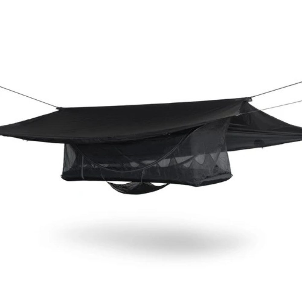 Toimitussisältö: riippumatto, tarppi, makuualusta, integroitu hyttysverkko, hiilikuituiset levitystangot, puunhalaajat, kiinnitysnarut, kiilat, karabiinit, pumppupussi ja Gear Sling