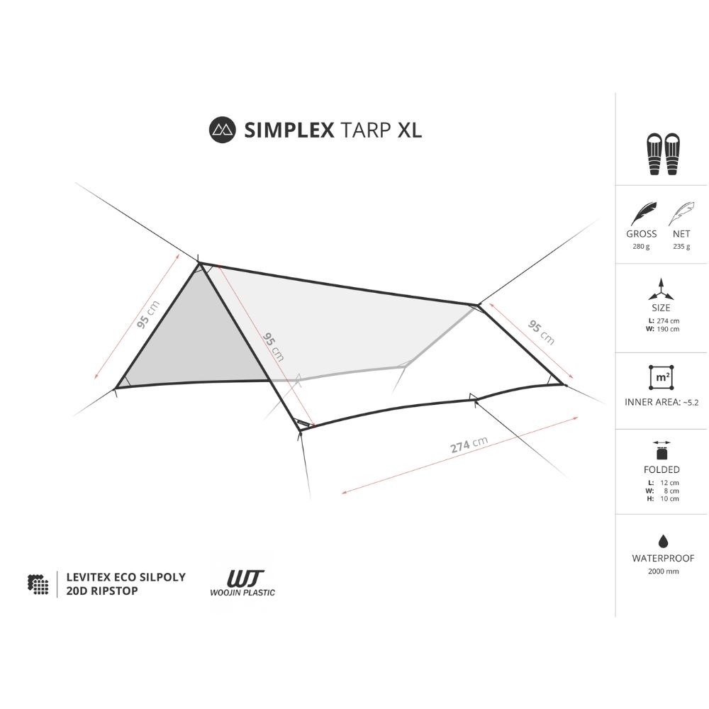 Silpoly tarpissa on noin 5,2 neliömetrin pinta-ala, joten kyse on yhden hengen tarpista, jossa on enemmän tilaa myös varusteille. Tarpin koko on 274 cm x 190 cm ja paino vain 235 g.